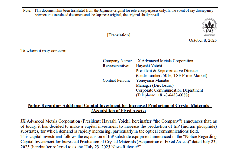 JX金屬在7月份宣布了首輪約15億日元的投資計(jì)劃(將產(chǎn)能提高約20%)。然而,鑒于AI持續(xù)演進(jìn)帶來的InP需求激增速度遠(yuǎn)超預(yù)期,公司決定進(jìn)一步追加投資。